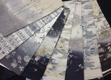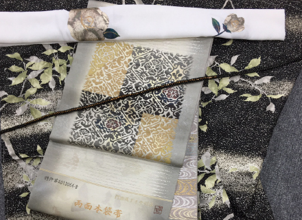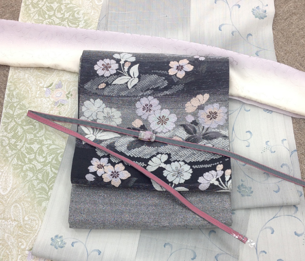 濃いグレー地に桜の可憐さが映える帯を